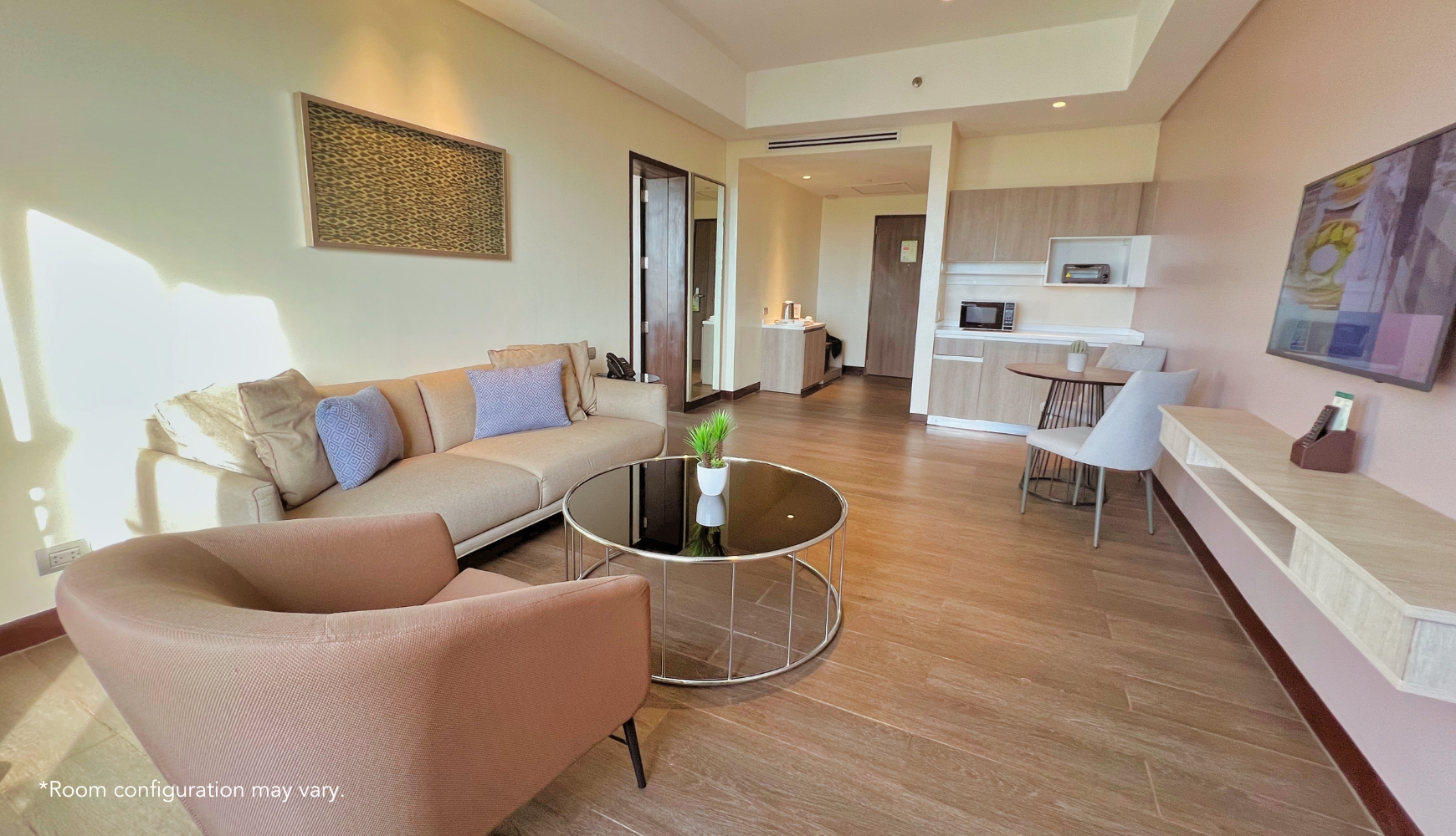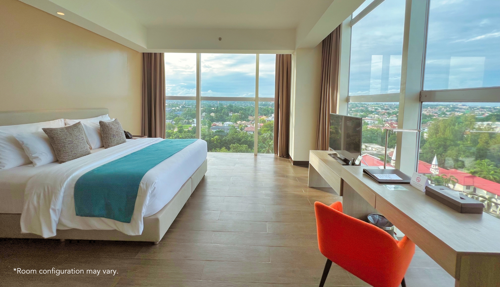 Experience luxury in our Executive Suite, designed with your comfort in mind. This spacious retreat features a separate living and dining area, a convenient kitchenette, and a private bedroom. Floor-to-ceiling glass walls offer breathtaking views of the vibrant cityscape of Davao, creating a perfect blend of relaxation and modern sophistication. Whether you’re here for business or leisure, the Executive Suite promises an elevated stay.